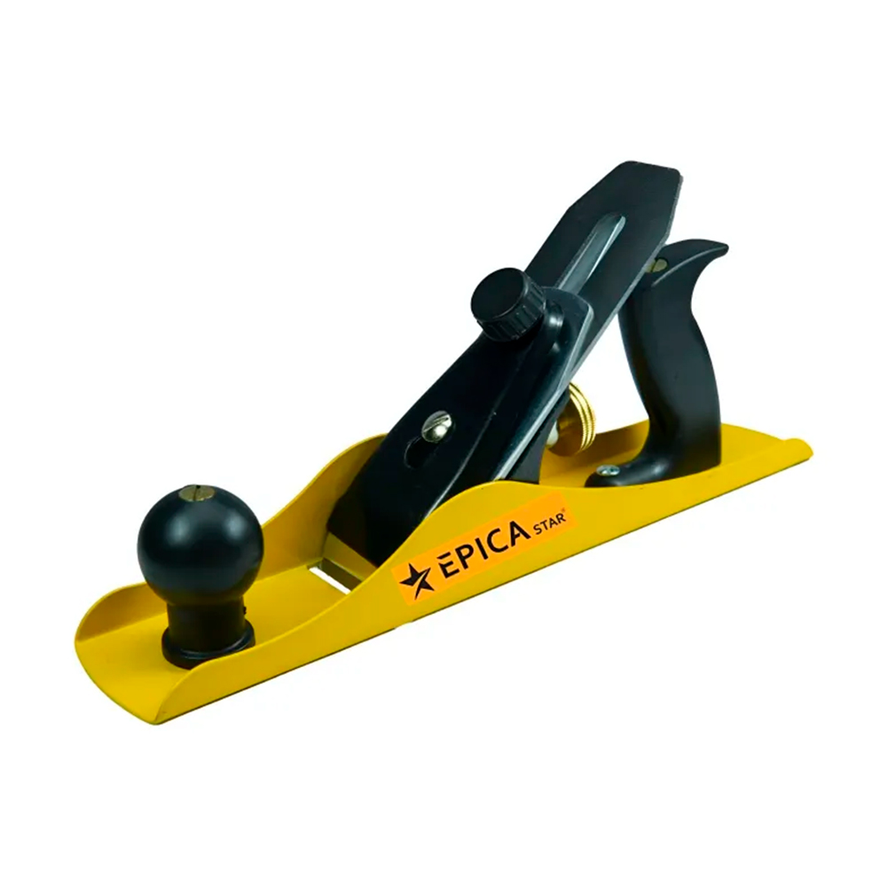 Cepillo de mano robusto, ideal para carpintería y ebanistería. Presenta un cuerpo de metal fundido de color amarillo vibrante y mangos ergonómicos de color negro para un agarre cómodo y control preciso. Se utiliza para alisar, dimensionar y rebajar la madera, dejando un acabado suave y uniforme